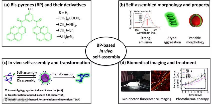 “体内自组装”策略用于体内原位构筑自组装纳米材料,而自组装过程可以根据需求进行精确的设计和调控。国家纳米科学中心的王磊研究员发展了一种双芘分子(BP)作为多功能建筑模块来对体内自组装的概念进行验证研究,BP分子在单体状态下无荧光,而在聚集状态下有荧光出现。通过分子间π−π相互作用,BP和其两亲衍生物能够在水溶液中自聚集成纳米颗粒。XRD分析证实,形成J型聚集体可以观察到典型的BP荧光发射,在水中,BP自组装成J型聚集体,使荧光增强了大约30倍。BP单元可以从单体状态到聚合状态进行可逆的控制,此外,BP纳米颗粒可以转化为纳米纤维。在特定的生理和病理条件的自然刺激下,酶、pH值和氧化还原可以实现原位自组装,有助于改善血液循环、靶向、积累、滞留/释放等过程以及诊疗剂的精准递送。除此之外,自组装BP纳米颗粒具有点亮的荧光信号,可用于监测体外和体内的自组装/解组装过程。