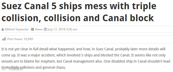 这是一起严事故,涉及5艘船,导致苏伊士运河当时封锁、造成严重拥堵和混乱。此次事故不仅5搜船舶受损,运河管理层也同时受到了指责。
