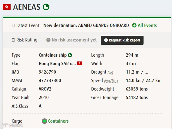 Container ship AENEAS, IMO 9426790, dwt 63059, capacity 5090 TEU, built 2010, flag HK, manager Anglo-Eastern Ship Management Ltd.
