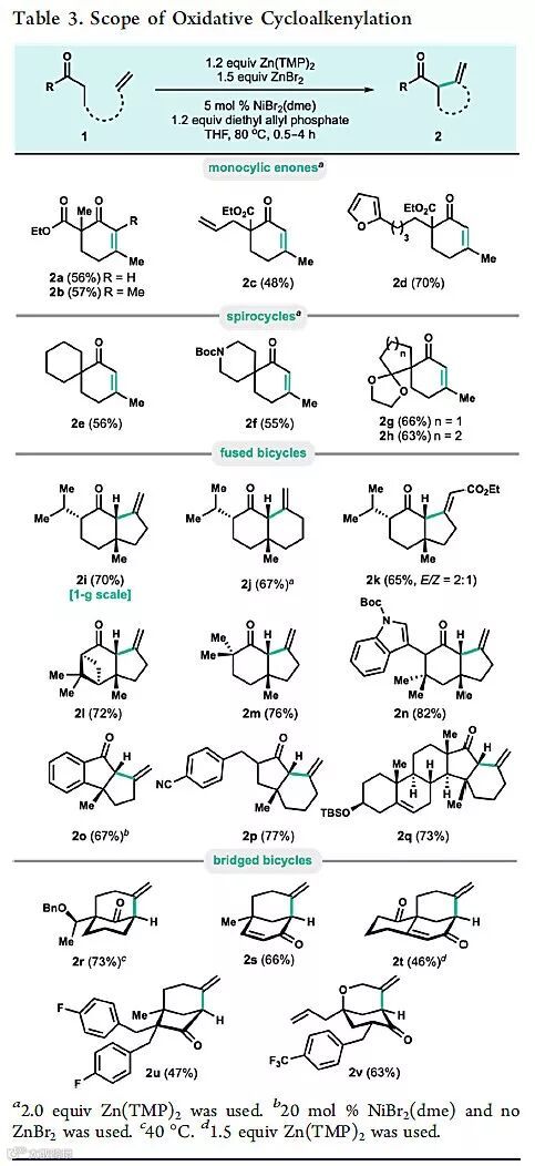 作者还以几乎相同的反应条件对酮的氧化型环烯基化反应进行底物适用范围的考察(图4),只改变碱和添加剂(Zn(TMP)2作为碱,ZnBr2作为添加剂)。他们发现使用ZnBr2添加剂是提高反应效率以及扩展底物适用范围的关键。在底物拓展中,作者证明了该反应可选择性合成六元环,不同于之前报道的Pd催化反应的五元环选择性。此外,作者不仅证实了该体系可实现烯基和羰基α位不同官能化的螺环与稠环底物的高效催化转化,也证明对于构筑天然产物中常出现的桥环核心骨架也具有很高的催化活性。值得注意的是,在作者进行底物拓展时,得到的产物均为外型的顺式环化产物,没有发现烯基异构化产物,这种较高的选择性相对于以往Pd催化的同类反应是一个巨大的优势。