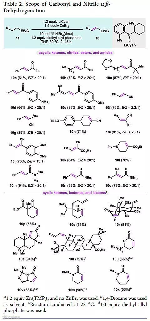 在条件筛选中(图2),作者考察了不同过渡金属催化剂以及碱对反应的影响,发现Ni催化剂(NiBr2(dme))、大位阻碱(LiCyan)和ZnBr2混合具有最好的催化活性。作者在底物适用范围的拓展(图3)中,不仅证明了各种取代基修饰的脂肪酮、酯、腈、和酰胺底物都具有良好的产率和Z/E选择性,环酮、酯、酰胺等类型的底物在Zn(TMP)2的作用下也能取得良好的产率。