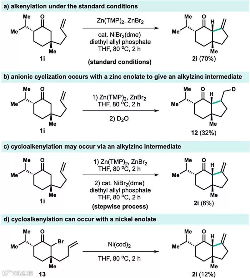 为了了解该反应中碳-碳键形成的催化机制,作者设计了对照实验。在没有Ni催化剂的参与下,反应没有发生β-氢消除,但得到了产率较低的环化产物12(图5b),说明烯醇化锌可能是构筑碳-碳键的前体。在先加入Zn盐、再加入Ni催化剂的分步反应中(图5c),作者得到了目标产物2i,但产率较低。在烯醇化镍为中间体的反应中(图5d),作者也仅得到了较低产率的目标产物2i,说明反应可能经历了烯醇化锌促进的环化过程,随后再进行Ni催化的β-氢消除反应,但也无法排除烯醇化镍的迁移插入过程。