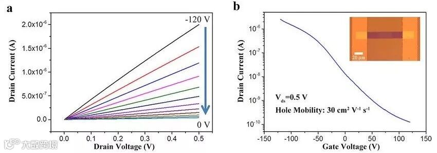 部分相变的样品天然的提供了一个1T’相及2H相的界面,为研究者研究碲化钼的接触提供了平台。通过电子束曝光以及反应离子刻蚀,研究者制备了1T’相接触的场效应晶体管,发现该晶体管具有很好的性能,这归功于单晶的碲化钼沟道以及良好的接触。