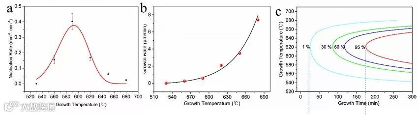 图3. 成核密度及相变速度随温度的变化曲线及TTT曲线。