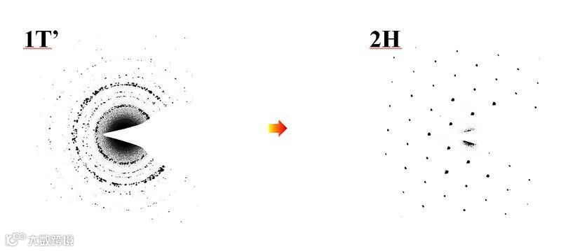 为了从原子尺度上表征相变过程,研究者将生长的薄膜转移到铜微栅上,通过透射电镜对相变前后的原子结构进行了表征。研究者发现,首先生长出来的1T’相碲化钼是一个多晶的结构,晶畴大小只有几十纳米,而相变之后的2H相的晶畴远大于几十纳米,选择的区域范围都是晶格完好的单晶。这说明在相变的过程中发生了重结晶的过程。通过进一步的暗场透射电镜的表征发现,研究者惊讶地发现,每一个成核中心都是一个完整的单晶结构。说明在相变的边界处,1T’相中的碲原子和钼原子跨过界面之后会按照2H相部分的晶格重新排列,形成单晶。