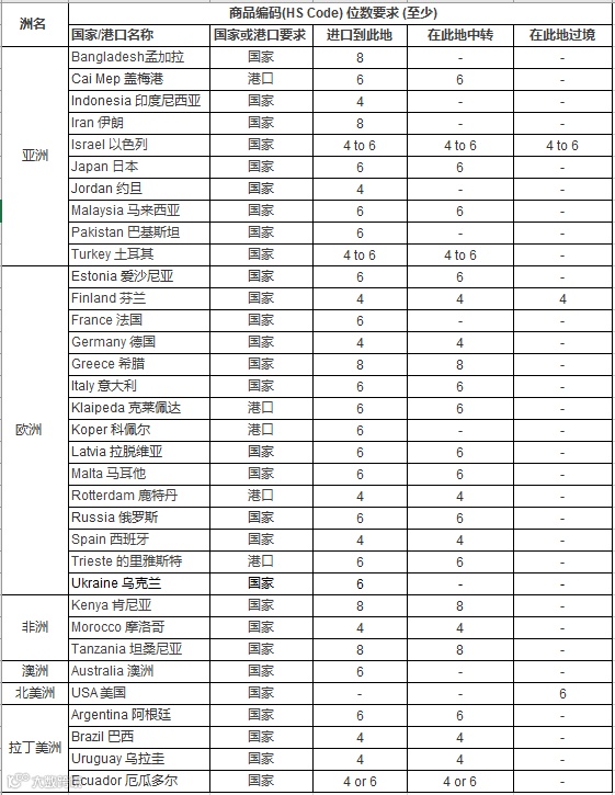 近年来,各国进口海关纷纷要求在进口的货物提单的信息中显示HS CODE的信息。在此我们为您汇总了到目前为止我们所收集到的各国对HS CODE的要求如下: