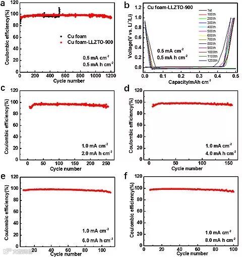 铜箔有限的比表面积,限制了金属锂沉积量的提高。因此选择将LLZTO固体电解质层固定在三维泡沫铜表面,得到Cu foam-LLZTO-900电极。半电池结果表明,Cu foam-LLZTO-900半电池循环圈数可以达到1200圈以上,其平均库伦效率在98%以上。而且金属锂的沉积量可以做到8 mAh cm-2。