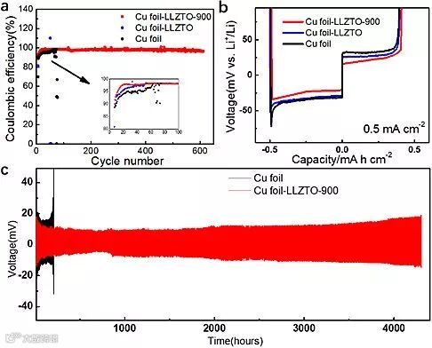 图1. (a)Cu foil-LLZT、Cu foil-LLZTO-900和Cu foil库伦效率-循环圈数图;(b)金属锂沉积在Cu foil-LLZT、Cu foil-LLZTO-900和Cu foil电极的极化数据。(c)Li//Li@Cu foil and Li//Li@Cu foil-LLZTO-900对称电池对比。