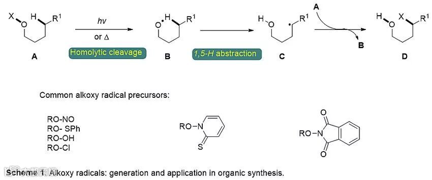自1959年Arigoni报道的烷氧自由基诱导远程C(sp3)-H键官能化反应以来,多种具有合成意义的相似反应已相继发展,其中最具代表性的莫属Barton反应。在机理方面,光解或热条件下O-X或O-金属键均裂产生烷氧基自由基B,该自由基会诱导1,5-氢原子转移过程(1,5-HAT)生成碳自由基C,进而攫取原料A中的X,进而实现δ-C(sp3)-H键官能化和烷氧基自由基B再生。烷氧自由基前体具有多种类型,如Scheme 1所示,由此类前体产生的烷氧基自由基可实现远端碳氧化成醇、烯以及发生分子内环化、杂环化等反应,或进行分子间对极化的双键加成以构筑C-C键或C-N键。尽管上述转化可完成远程C(sp3)-H键的官能化,提供多种官能化产物,但多数是链式反应,限制了反应多样性以及合成应用的潜力。