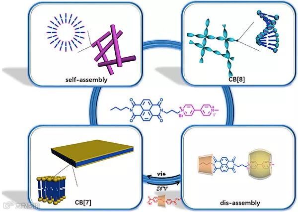 实验表明,萘二酰亚胺客体分子(C4-NDI-MV)单独存在时,分子自组装形成纳米管状结构;向其中加入葫芦脲[7](CB[7])时,由于主客体包结作用,使C4-NDI-MV⊂CB[7]形成纳米片层状的结构;而向客体中加入葫芦脲[8](CB[8])时,则出现精美的螺旋带状结构,作者推测这一现象是由大环尺寸效应引起的。作者在研究中还发现,C4-NDI-MV⊂CB[7]组装体可以由α-环糊精(α-CD)与偶氮苯(Azo)的包合物进行调节,即当 C4-NDI-MV⊂CB[7]和Azo⊂α-CD共存的时候,纳米结构依旧呈现出片层状,一旦用365 nm紫外光照射该四组分体系,Azo从α-CD的空腔中脱离出来,游离的α-CD则会包结在萘二酰亚胺客体分子的烷基链部分,导致组装单元的亲疏水性质发生改变,从而致使纳米片层结构瓦解;该过程可以通过可见光的照射恢复为纳米片层结构。如此,该体系可以借助紫外光/可见光的交替照射实现纳米结构的可逆调控。