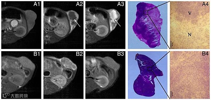 Figure 4. MR images of rats bearing W256 treated with CA4P at pre-injection and 0 h, 3 h post-injection of GdL1 and corresponding H&E-stained tumor section (A1-A4), white arrows indicate the necrotic areas of tumor; MR images of rats bearing W256 treated with saline at pre-injection and 0 h, 3 h post-injection of GdL1 and corresponding H&E-stained tumor section (B1-B4), (H&E, ×200).