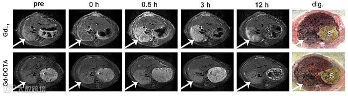 Figure 2. The MR images of rat models of reperfused liver infarction at pre-injection and 0 h, 0.5h, 3 h, 12 h post-injection of GdL1 (0.1 mmol/kg) and Gd-DOTA and corresponding macroscopic section. White arrow shows necrotic liver, S indicates stomach