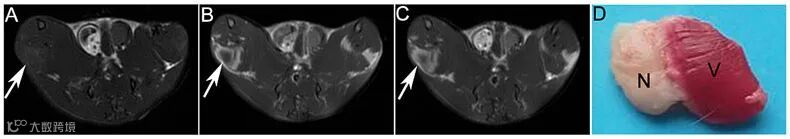 Figure 3. MR images and corresponding TTC staining images of rats with muscular necrosis. A-D were images of rats with muscular necrosis at pre-injection and 0 h, 3 h post-injection of GdL1 (0.1 mmol/kg) and corresponding TTC staining images of necrotic muscle. White arrow shows the necrotic muscle, Necrosis (N), Viable (V).
