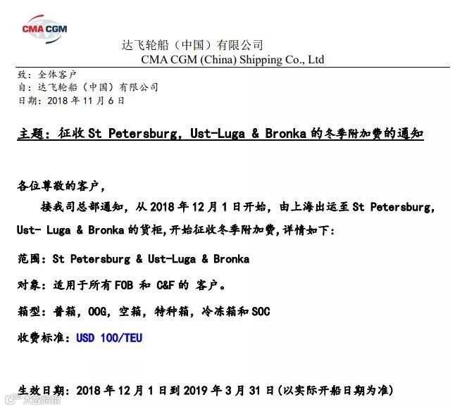 各位尊敬的客户, 接我司总部通知,从2018年12月1日开始,由上海出运至 St Petersburg, Ust- Luga & Bronka的货柜,开始征收冬季附加费。