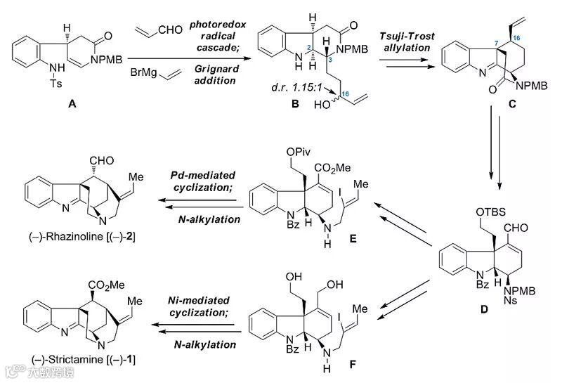 下图所示为详细的合成路线。大量易得的手性烯酰胺化合物A在一锅中通过连续的光催化自由基串联及格氏加成反应制得三环中间体B。后者经Tsuji-Trost烯丙基化反应建立C7季碳手性中心生成四环产物C,进一步的官能团转化可合成得共同中间体D。D转化为烯酯底物E后,经Pd-介导的环化反应及分子内N-烷基化反应合成了(–)-rhazinoline。由于直接的差向异构化尝试未能逆转C16位的立体化学,最终,从烯丙醇F出发,Ni-介导的环化及分子内N-烷基化反应过程可实现具有C16位不同立体构型的(–)-strictamine的合成。