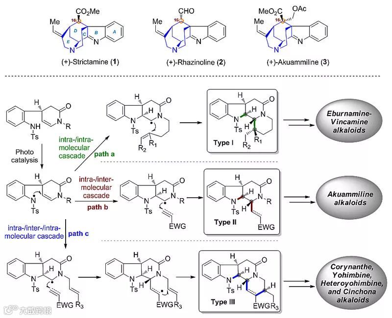 Strictamine及其同系物(下图,1–3)是灯台生物碱中特殊的一类,具有笼状五环母核结构,包括一个罕见的桥亚甲基喹诺里西丁结构单元。Strictamine及其天然同系物结构上的主要差别在于C16位具有多样的取代基团和不同的立体构型。尽管已有研究组报道了此类生物碱的合成,然而,如何发展高效新颖的合成方法及策略同时实现具有C16位不同立体构型的strictamine类灯台生物碱的不对称全合成仍然备受关注。四川大学华西药学院秦勇教授团队在前期研究中通过光催化条件下直接活化N–H键产生氮自由基,发展了分子内/分子内、分子内/分子间和分子内/分子间/分子内等三类自由基串联反应,分别高效地合成得到如图所示的白坚木型(Type I)、四氢咔波啉型(Type II)和柯楠因型(Type III)三种官能化的手性单萜吲哚生物碱骨架,并实现了相应天然产物群的全合成(Chem, 2017, 2, 803; Angew. Chem. Int. Ed., 2018, 57, 12299; Chem. Commun., 2018, 54, 9510; Org. Lett., 2019, 21, 252)。最近,秦勇教授课题组进一步利用Type II型自由基串联反应完成了灯台生物碱(–)-strictamine和(–)-rhazinoline的不对称全合成。