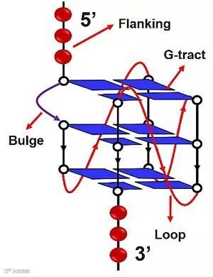 图1. G4结构的几种微观结构域:G-tract,Loop,Bulge,Flanking