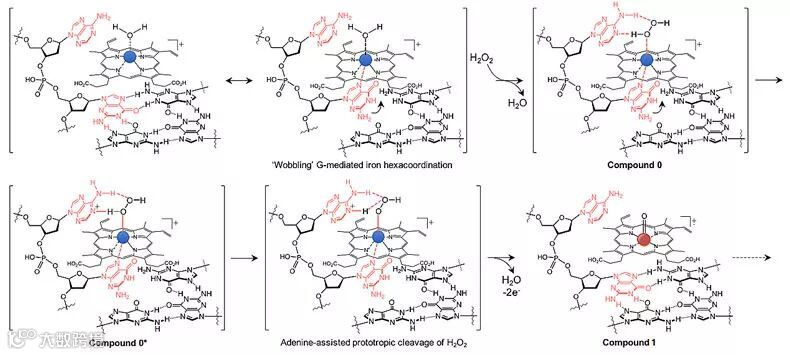 针对这种长度依赖性,研究组进一步在loop结构域和flanking结构域设计了100多种不同组合的碱基组成,发现dA和dC碱基对G4/hemin DNA酶活性的激活能力具有位置依赖性,且同时存在于loop和flanking区域,该工作解释了dC碱基激活能力不如dA碱基的原因。作者还采用不同的方式(碳链或是双链)调节dA(或dC)碱基到G4末端平面之间的距离,确认该位置选择性的普适性,并提出了新的催化机制——临近碱基促进催化中间体生成(如图2所示)。该工作成功获得高活性的DNA酶,有望用于以G4/hemin为信号输出方式的生物传感,提高其检测灵敏度。
