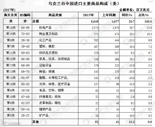 2017年,乌克兰自中国进口的主要产品为机电产品、贱金属及制品和化工产品。其中,机电产品进口25.7亿美元,增长30.7%,占乌克兰自中国进口总额的45.6%;贱金属及制品进口5.7亿美元,增长20.4%,占乌克兰自中国进口总额的10.1%;化工产品进口5.0亿美元,增长13.1%,占乌克兰自中国进口总额的8.9%。此外,运输设备进口额增幅较大,增长43.8%。而鞋靴、伞等轻工产品进口额降幅较多,下降10.6%。