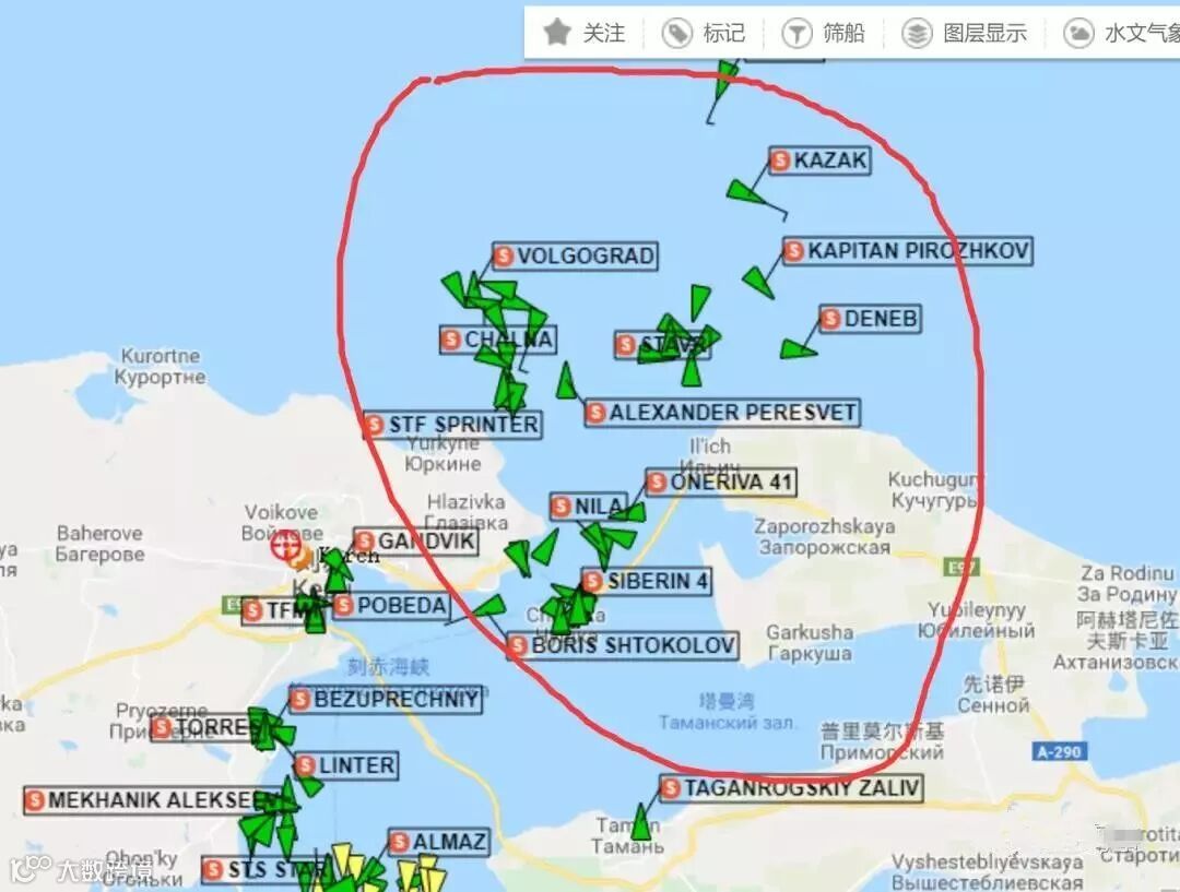 另根据传讯网提供的卫星AIS船位显示,在刻赤海峡大桥以南靠近黑海一端,有大量船舶处于抛锚状态。目前信德海事网已委托船讯网技术部门推演是本次俄乌冲突是否造成大量船舶抛锚于此。暂未有结果。