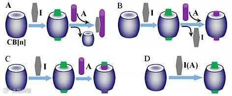 因其能与大量配体分子形成特异性结合的主-客体复合物,葫芦脲(CB[n])是一类在分子识别方面具有潜在应用价值的工具分子。近年来,通过已开发的CB[n]的功能性客体分子以及外部刺激响应原理的核酸超分子研究已经得到了实际应用,如:G-四链体、双链结构操控,核酸杂交的蛋白质抑制剂的释放,可控的DNA延伸,纳米孔的DNA损伤的检测,释放原理的miRNA的检测,增强细胞对RNA染色的摄取成像和可调控的DNA纳米孔转移等方面。近来已发展的基于CB[n]的超分子传感器包括三个原理:指示剂取代分析(IDA,图B),联合结合分析(ABA,图C)和直接结合分析(DBA,图C)。可以看出,无论是DBA、IDA还是ABA,都需要分析物与CB(n)直接结合。因此,目前这些方法限制了对于像DNA这样大尺寸分析物的应用。虽然通过复杂合成路径设计的荧光分子实现了超分子比率DNA解码,但是,目标物浓度依赖的波长响应的免标记多色DNA解码仍然是一个巨大的挑战。
