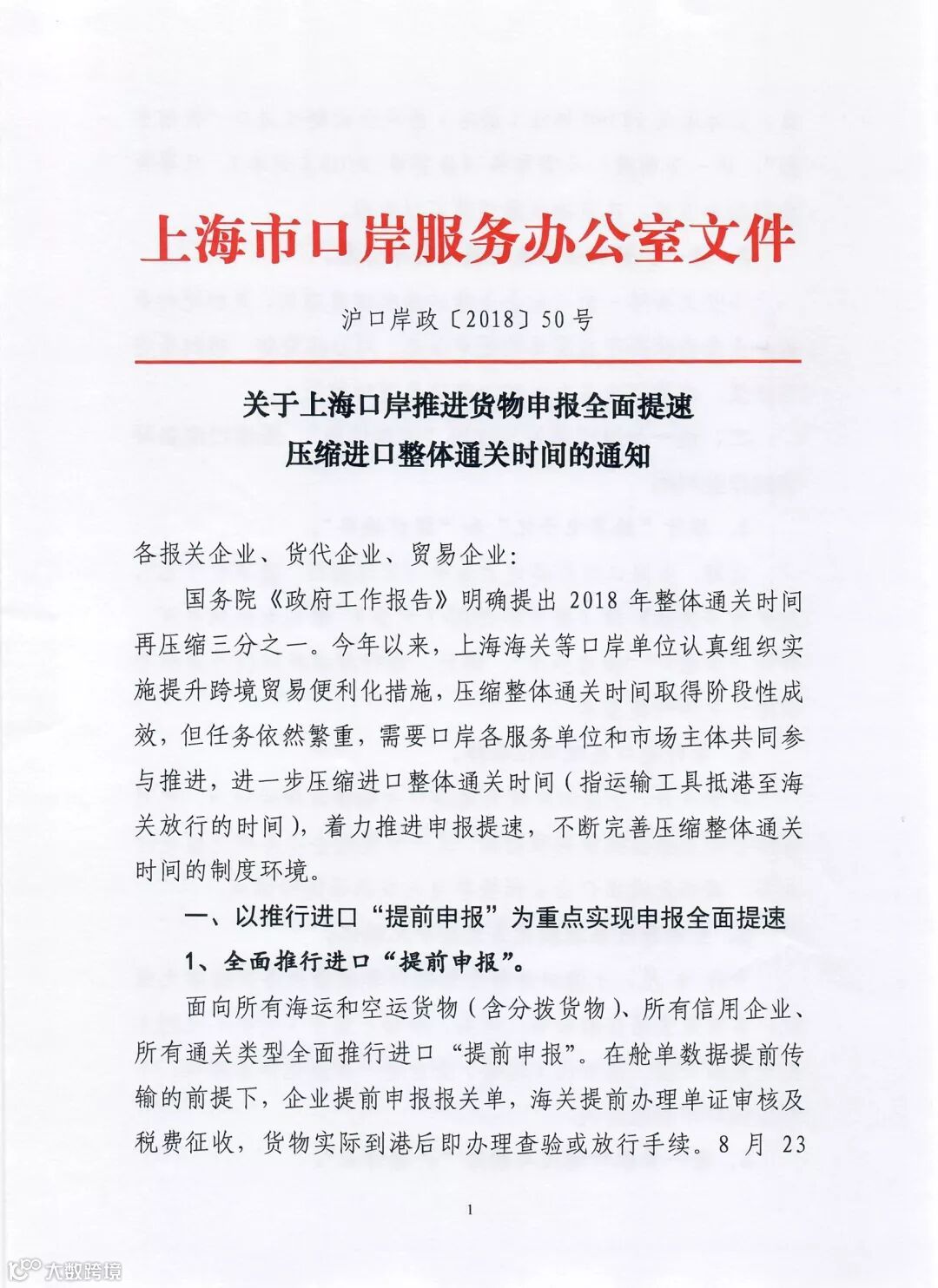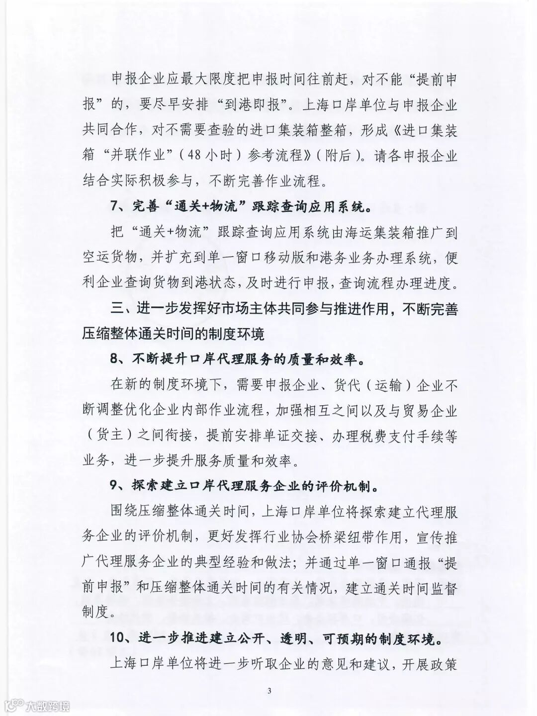 国务院《政府工作报告》明确提出2018年整体通关时间再压缩三分之一。今年以来,上海海关等口岸单位认真组织实施提升跨境贸易便利化措施,压缩整体通关时间取得阶段性成效,但任务依然繁重,需要口岸各服务单位和市场主体共同参与推进,进一步压缩进口整体通关时间(指运输工具抵港至海关放行的时间),着力推进申报提速,不断完善压缩整体通关时间的制度环境。