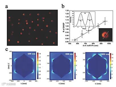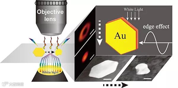 为了解决上述问题,西南大学的黄承志教授以及邹鸿雁副教授团队将形状作为成像分析元素,选择金六边形纳米片作为成像探针,借助暗场光散射成像技术发现当纳米片粒径超过500 nm时,暗场成像从实心光斑转变为具有边缘效应的甜甜圈形状的远场散射模式,这一现象的出现是由于纳米片锐边的局域表面等离子体并非传播表面等离子体的作用,并在此基础上考察了粒径与纳米片光散射成像的线性关系,随后实时监控了在铁离子和硫脲作用下的腐蚀反应过程,实现了边缘效应从有到无的转变。此种具有边缘效应的二维纳米材料探针在暗场下通过直接成像的方式揭示了形状变化信息,有助于认识反应的机制,为化学反应的监控提供了一种简单有效的平台。