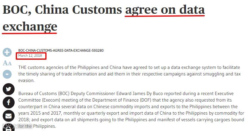 2018年3月的消息,菲律宾海关和中国海关同意建立数据交换系统,以促进贸易信息及时分享,并帮助两国开展反走私和反漏税活动。