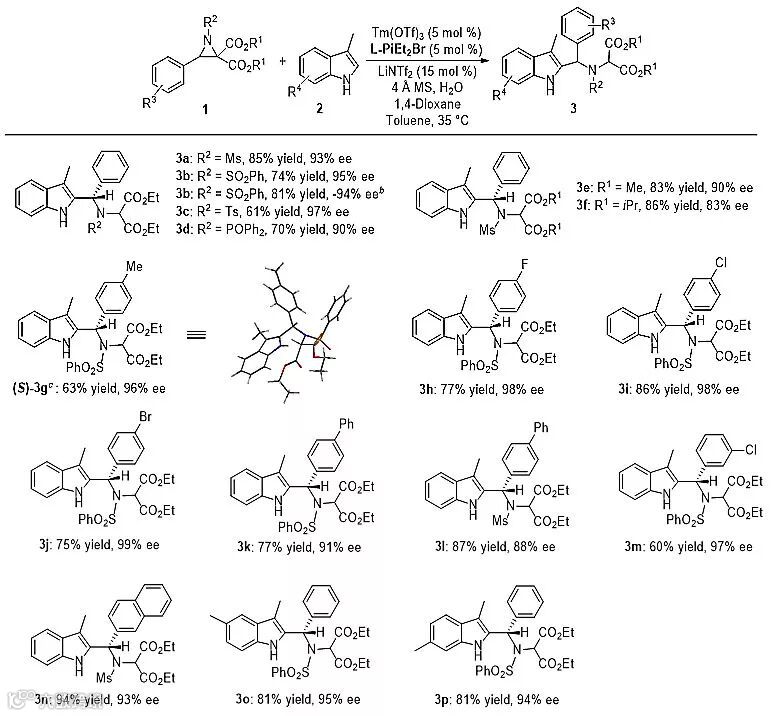 aAll reactions were carried out with 1 (0.10 mmol), 2 (0.10 mmol),Tm(OTf)3/L-PiEt2Br (1:1, 5 mol%), LiNTf2 (15mol %), 4 Å MS (100 mg), H2O (10 μL) and 1,4-dioxane (37.5 μL) in toluene (2.5 mL) with at 35 °C for 24 h. Yield of isolated product. Ee values were determined by UPC2 analysis. bent-L-PiEt2Br was used instead of L-PiEt2Br. cThe absolute configuration of 3g was determined to be S by X-raycrystallographic analysis. The absolute configuration of other products was determined to be S by comparingthe Cotton effects in their CD spectra to that of 3g.