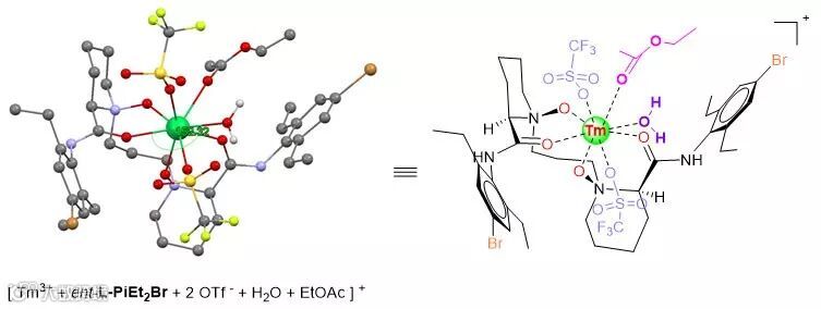 研究中他们发现,同时加入微量的水和1,4-二氧六环可以明显提升反应的选择性和收率。为了解释添加剂的作用及分析催化剂的结构,冯小明课题组培养出Tm(OTf)3/ent-L-PiEt2Br和Ho(OTf)3/L-RaPr2的单晶。由Tm(OTf)3/ent-L-PiEt2Br的单晶结构可知(Figure 1),两个极性氮氧的氧原子和两个酰胺羰基的氧原子与金属离子Tm(III)以四面体的形式配位。两个三氟甲磺酸根负离子、一个水分子和乙酸乙酯与Tm(III)配位,进而形成变形的十二面体。两个酰胺的氧原子与中心金属形成的键角为152.32°,而不是线性的180°。Tm(III)的高配位数使其与配体、溶剂分子和底物的配位形式具有更多可能性,催化剂的手性空间调控更加灵活。