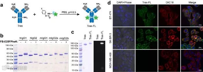 为了探究这一新方法在生物领域中的应用,他们通过在FB蛋白上连接荧光基团的方法来标记抗体蛋白。首先,他们通过对FB蛋白基因修饰,将一个苯丙氨酸位点变异成色氨酸,然后通过马来酰亚胺修饰色氨酸将荧光基团偶联到FB蛋白上。带有荧光基团的FB蛋白随后与免疫球蛋白G按照8:1的摩尔比例混合,在37 ℃下放置两天。荧光基团标记的免疫球蛋白G分别与Her2阳性与阴性细胞混合固定后,通过激光扫描共聚焦显微镜观察免疫球蛋白G对Her2的特异性结合能力。实验表明,只有Her2阳性的细胞表面有荧光反应,从而证明了利用临近诱导效应标记免疫球蛋白的可行性。这一成果得到包括Medical Express、TMC News、FUTURITY、EurekAlert!在内的多个医学前沿新闻媒体报导和转载。目前Xiao教授及其团队正在尝试通过固态合成FB蛋白的方法将更多的功能性基团偶联到抗体上,并提高抗体标记的灵敏性。相关研究发表在Bioconjugate Chemistry上。