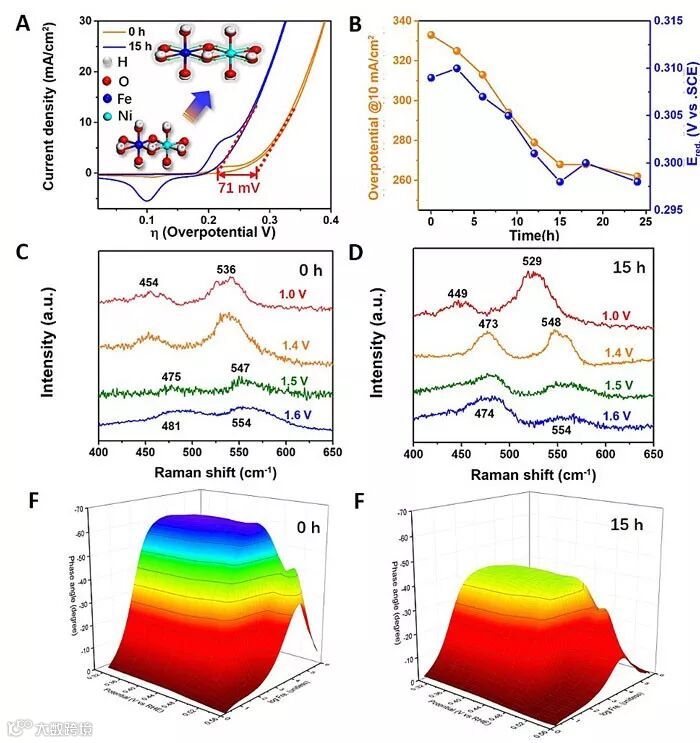 通过图2A和B可以发现,经过机械力化学法处理后NiFe-LDH的析氧反应起峰位降低了71 mV,同时有三价镍还原到二价镍的峰位置向低电位偏移说明NiFe-LDH与反应含氧中间体的吸附明显增强;图2C和D的原位拉曼对比可以发现经过处理的NiFe-LDH在更低的电位下转变为高催化活性的羟基氧化物;图2E和F中Bode曲线对比发现经过处理的NiFe-LDH其电流对电压的相位角更小,说明催化反应中更多的电子被有效地利用起来。