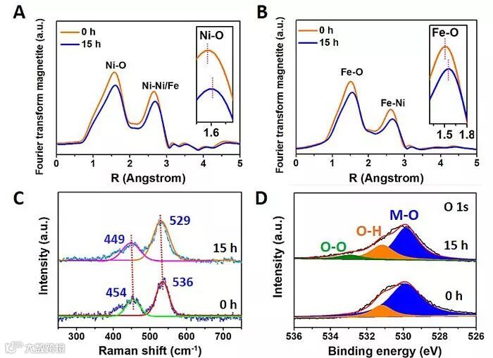 图1. 机械力化学法处理前后NiFe-LDH的(A)Ni-O键键长变化;(B)Fe-O键键长变化;(C)拉曼对比;(D)O 1s 的XPS对比。