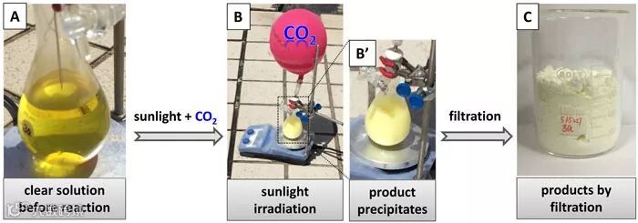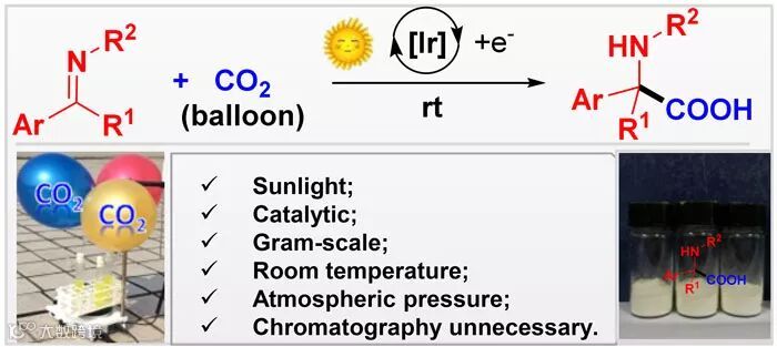 基于上述研究基础,他们探索解决可见光(太阳光)促使亚胺对二氧化碳亲核加成反应的难题。经过对反应体系的合理设计以及反应条件的优化筛选,他们发现以金属铱光敏剂作为催化剂,二环己基甲胺作为电子供体,室温条件下,亚胺对二氧化碳的亲核加成反应可以顺利进行,并以较高的产率得到目标氨基酸产物。在实验中他们发现,随着反应的进行,产物以固体的形式从反应液中析出。反应完成后,经过简单过滤就可得到目标分子,可以避免色谱等繁琐的纯化步骤。对反应底物的考察表明,该方法具有较好的的底物适用性。