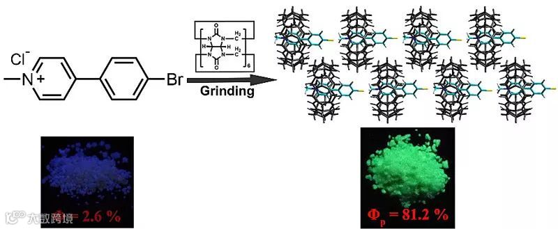 基于这个实验结果以及课题组数十年来对大环及超分子化学的深入研究,他们选取了葫[6](Cucurbit[6]uril)作为主体,利用固相合成法与PYX键合,期望进一步提高磷光。有趣的是,复合物的磷光确实得到了极大地增强,达到了81.2%,这也是迄今纯有机室温磷光量子产率的最高纪录。单晶数据表明,量子产率如此大幅度的提升主要归因于两点:一是葫[6]分子形变为椭球状,紧密的包结PYCl,极大地抑制了非辐射跃迁;二是葫[6]上的羰基与PY距离很近,促进了系间窜越。他们也考察了大环尺寸效应的影响,发现更大或更小的主体都没有这种促进效果。