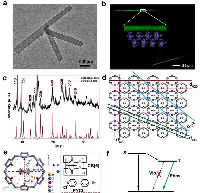 进一步研究形貌,他们发现复合物是微米级的纤维,X射线粉末衍射的实验数据及模拟数据确定其堆积模式为葫芦脲分子层层上下对齐,客体分子占据其空腔,这种模式也与单晶结果吻合良好。该工作为研发高产率室温磷光提供了新方法,也为固相合成主客体复合物及组装体扩充了实例。