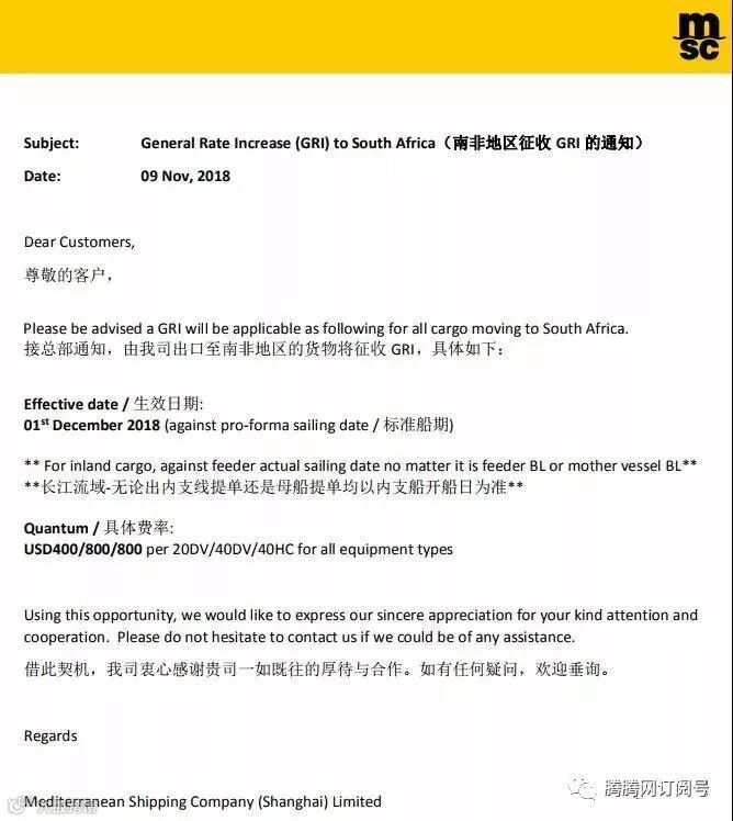 MSC南非地区征收GRI的通知