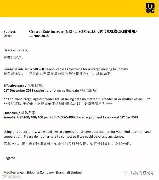 MSC出口索马里地区征收GRI的通知