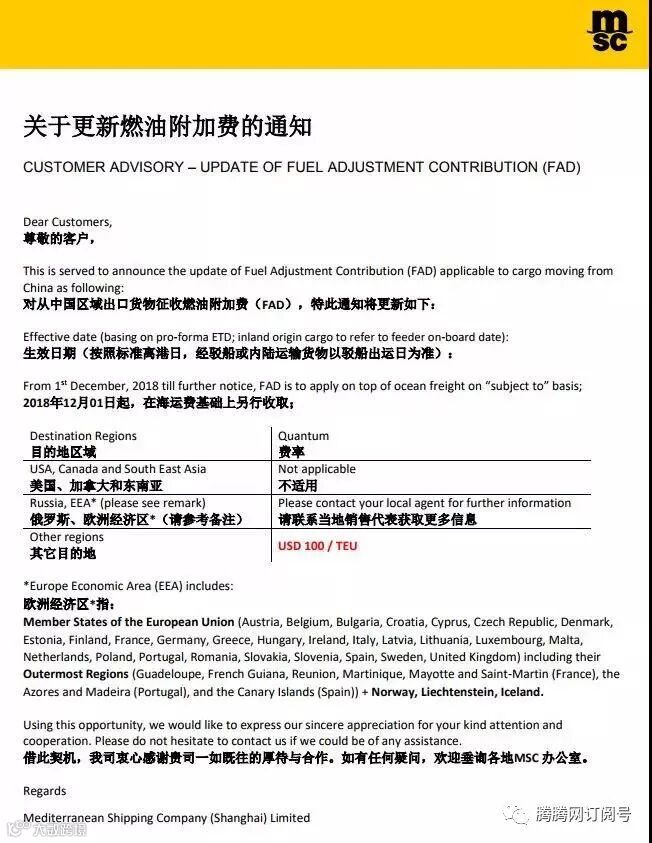 MSC关于更新燃油附加费的通知