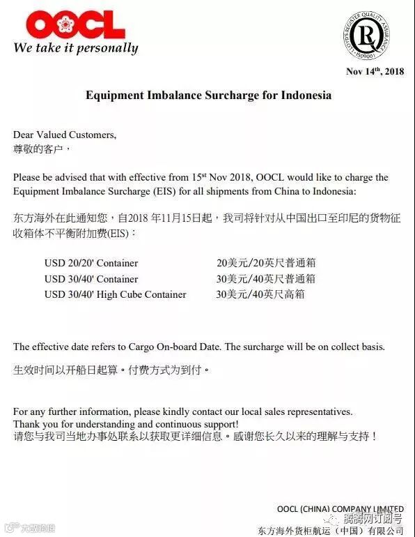 尊敬的客户,东方海外在此通知您,自2018 年11月15日起,我司将针对从中国出口至印尼的货物征收箱体不平衡附加费(EIS)。