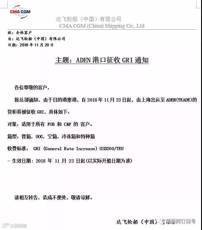 由于目的港塞港,自2018年11月23日起,由上海出运至ADEN(YEADE)的货柜将被征收GRI。