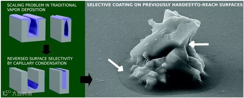 这项工作表明超共形涂层可行且非常理想,而且这种超共形性是可控的,甚至可以控制在哪个点气相沉积具有表面选择性。此外,由于这种毛细/曲率选择性气相沉积(CSVD)方法解决了现有许多气相沉积方法的一些问题,例如对气相杂质敏感或需要泵送。作者们认为这项研究为一项全新的气相沉积模式奠定了基础。由于该过程非常简单,所以即使是新手使用廉价简单的自制反应器也非常容易操作。