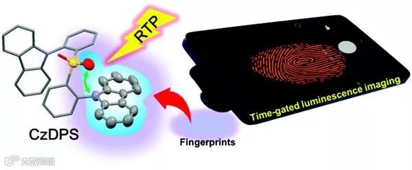 通过简便的设计策略合成了有机分子CzDPS,该分子利用分子内电子耦合能够持久发光。已有报道的许多有机分子仅在结晶状态或聚集态才观察到持久发光,而CzDPS由分子内电子耦合诱导的系间窜越并不依赖于任何分子间相互作用,因此当其掺杂浓度仅为1 wt%时,也可以在聚集态和交联聚合物中持久发光。可以预见,该策略可应用于设计其他具有持久发光的分子,用于低掺杂浓度的许多复合材料中。CzDPS的持久发光使其能够用于指纹的时间分辨发光成像,该检测仅靠紫外LED和智能手机即可实现。这一发现为指纹的法医学检测提供了一种简便的策略,可避免基底散射和荧光信号的干扰。