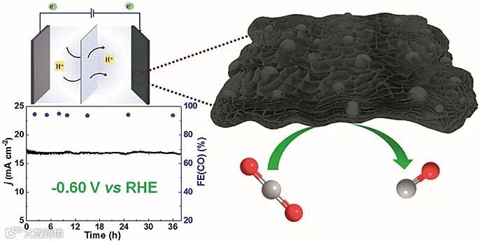 中国科学院化学研究所和高能物理研究所的研究人员将CuxNiy 合金纳米粒子嵌入氮-碳网络中作为电催化剂,催化CO2至CO的转化,法拉第效率最高可达94.5%。该催化剂具有较强的CO2吸附能力,克服了单一铜和镍催化剂的缺点,且由于氮-碳网络的稳定作用而非常稳定。