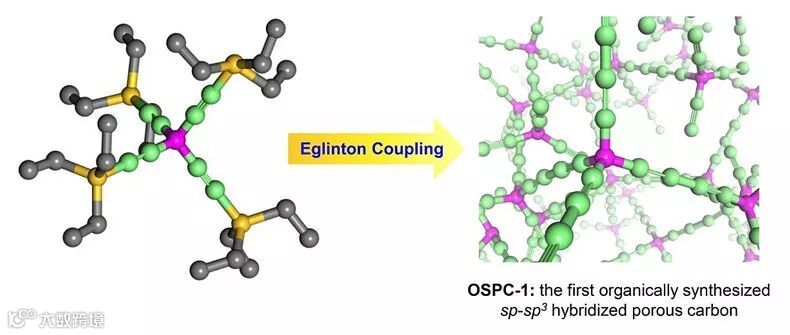 多孔碳的传统制备方法,如物理/化学活化碳化法、模板法、弧放电或激光烧蚀等都面临一个共同的难题:无法从分子水平上对碳的杂化方式进行控制。吉林大学的贲腾教授课题组通过设计结构构筑基元,采用有机合成策略,从分子水平上设计并制备了首例仅由sp3碳原子和sp碳原子组成的三维有机合成多孔碳材料(Organically Synthesized Porous Carbon, OSPC-1),这种多孔碳材料表现出高比表面积、高导电性、高稳定性,并在锂离子电池领域表现出巨大的应用潜能。该课题组采用乙炔基甲烷作为初级构建单元,通过Eglinton聚合制备得到仅由sp与sp3碳组成的有机合成多孔碳材料(图1)。