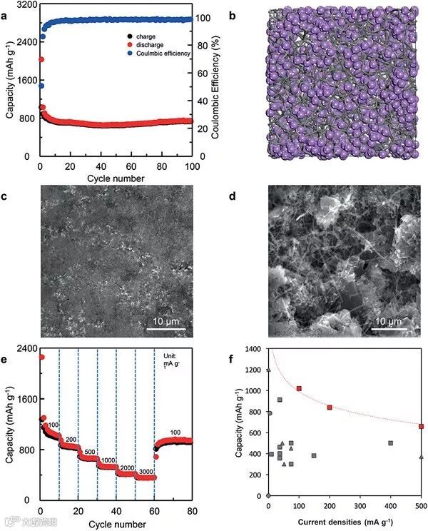 由具有明确杂化方式碳原子组成的高导电性、高比表面积的OSPC-1在用作锂离子电池电极材料时表现出明显优于其他碳材料的优异性能。OSPC-1在200 mA•g-1的电流密度下循环100次,具有784 mAh•g-1的超高容量(图4a),与构建的结构模型理论容量保持一致(图4b);分子动力学模拟计算的锂离子在OSPC-1微孔区域中的传输效率达到~4×10-4 cm2•s-1,与聚合物电解质中的效率相当,并高于常规电极材料石墨。相同过充实验条件下,OSPC-1电极能够完全抑制锂枝晶的生长(图4c),而石墨电极表面则有大量锂枝晶形成(图4d);OSPC-1具有优异的倍率性能(图4e),加之高锂离子储存量,在锂离子电池领域具有极大的应用潜能(图4f)。