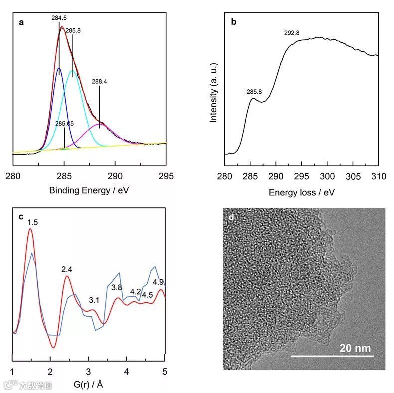 图2. (a)OSPC-1的C1s XPS谱图;(b)EELS谱图;(c)G(r)红色:实验,蓝色:模拟;(d)TEM谱图。