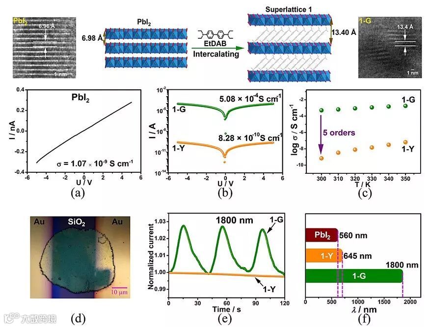 图1. 碘化铅超晶格:自由基状态(1-G)比非自由基状态(1-Y)和二维碘化铅具有5个指数电导增益和更宽的光电导响应范围。