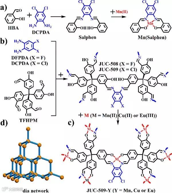 由于Salphen基团独特的结构特点,可以螯合金属离子用于催化、分离等方面,因此,将Salphen结构单元直接引入到COFs材料的骨架中去,可以直接得到功能化的COFs材料。利用氨基与醛基之间的缩合反应,选用两种邻苯二胺类单体与醛基单体反应,得到了两种三维Salphen-COFs材料:JUC-508和JUC-509。随后对JUC-509进行后修饰,得到了金属化的三维COFs材料。