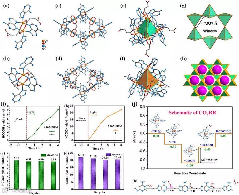 随着大气中人为CO2排放量的与日俱增,由此产生的能源和环境问题日趋严重,亟待解决。太阳光激发的人工CO2还原反应通过效仿植物光合作用可以有效地将CO2转化为高值的化工产品或碳氢燃料,同时还能降低大气中的CO2浓度,可谓“一箭双雕”。因此,它是一种极具潜力的仿生转化路径。考虑到CO2分子固有的化学惰性,其吸附和活化过程必须借助有效的催化剂来完成。而且,催化剂的活性位点、可见光吸收、反应的微环境以及与CO2的亲和力等因素的协同作用对整个转化过程来说是至关重要的。目前,金属有机框架(MOFs)化合物作为催化剂在光催化还原CO2领域已经崭露头角。这类孔状材料不仅可以利用开放的活性组分或位点来吸附和活化CO2分子,而且还能通过特定功能化修饰的有机配体来进一步调控材料的可见光吸收能力和孔道微环境,这为光催化CO2还原反应的研究提供了良好的先决条件。然而,MOF在水中较差的结构稳定性及其有毒的有机组分极大地限制了其在光催化CO2还原反应中的应用。近期,南京师范大学兰亚乾教授课题组设计合成了两个绿色的仿生AD-MOF并对它们的光催化CO2还原性能进行了研究。